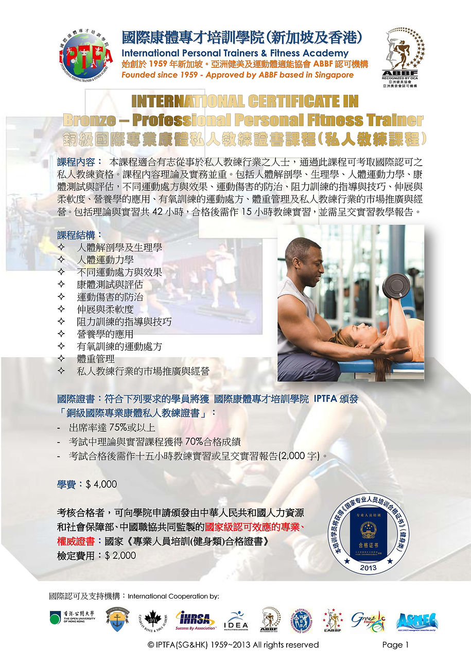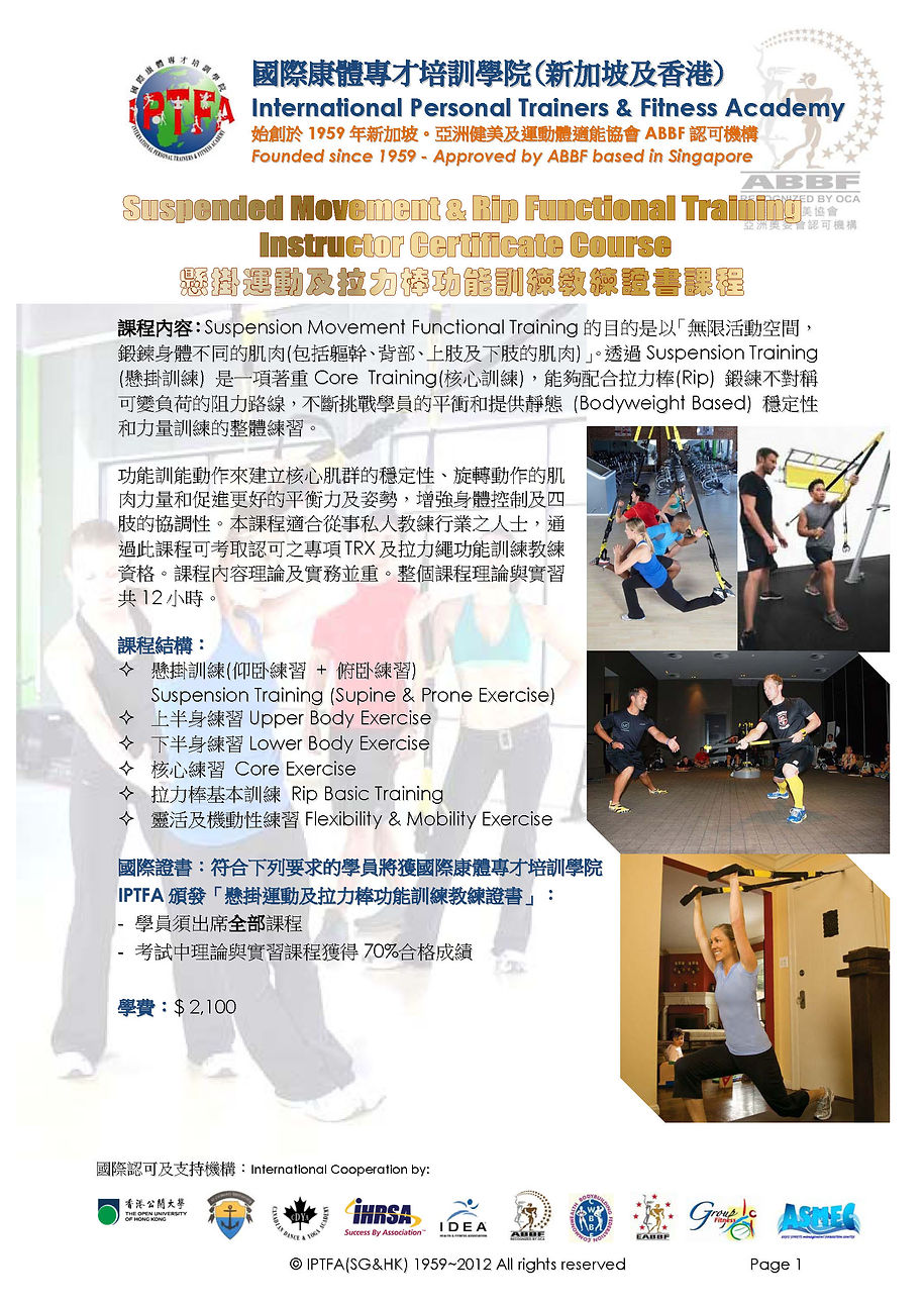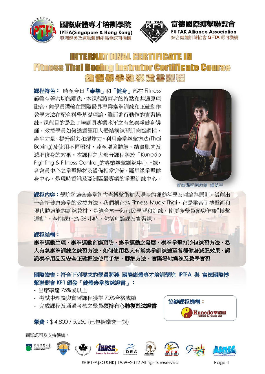 本會跟國際康體專培訓學院(IPTFA)合作舉辦健體泰拳導師證書課程,目的是為了培訓具專業水平之有氧秦拳健身導師,教授學員如何透過運用人體結構練習肌肉協調性,產生力量、提升耐力和爆炸力。詳情請向本會查詢。